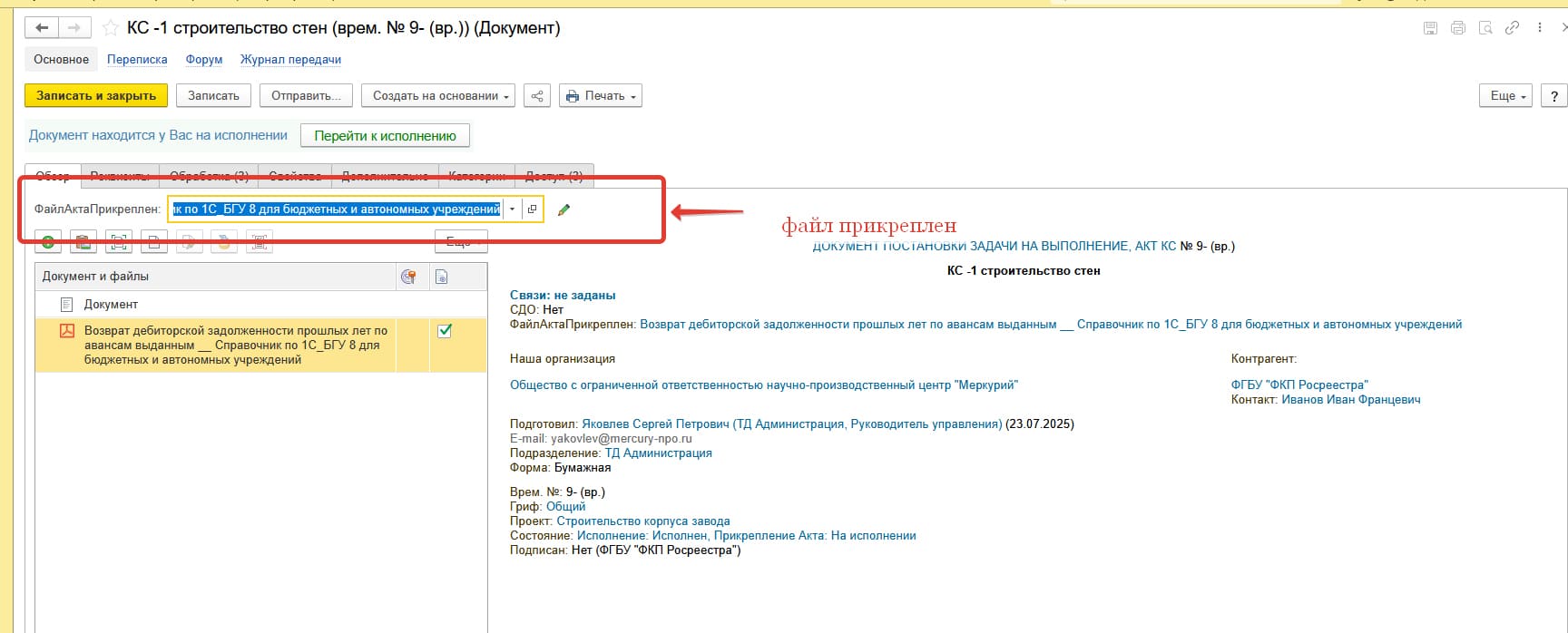 и отправляется подрядчику для ознакомления в 1С Документооборот.
