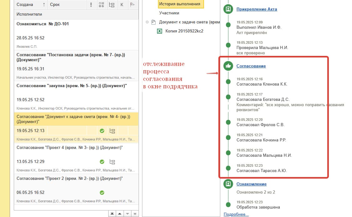 - Итог согласования ( согласовано/отклонено) отправляется подрядчику в "Задачи мне".