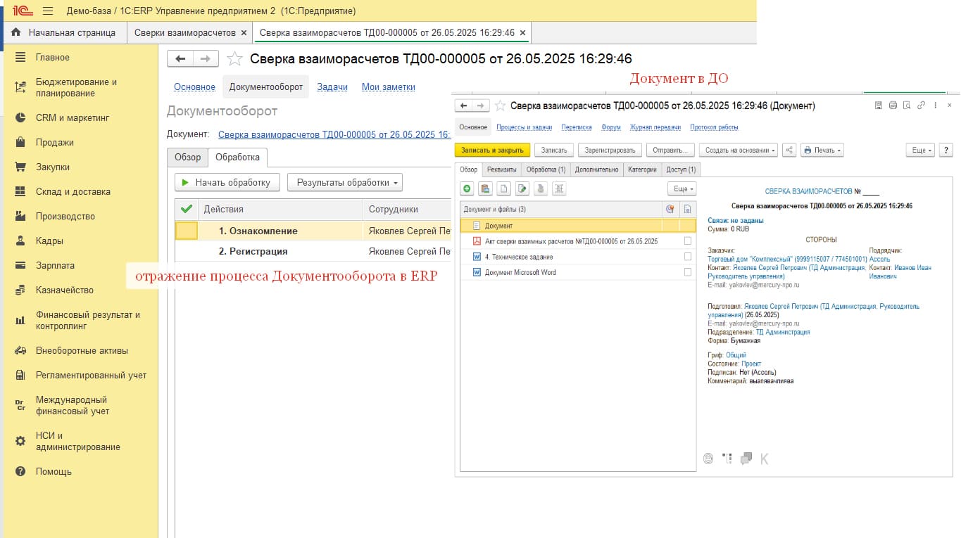 - Внедрение основано на типовой бесшовной интеграции 1С ERP Управление строительной организацией с 1С Документооборот 3.0, дополненной ключевыми доработками для специфики работы с подрядчиками.