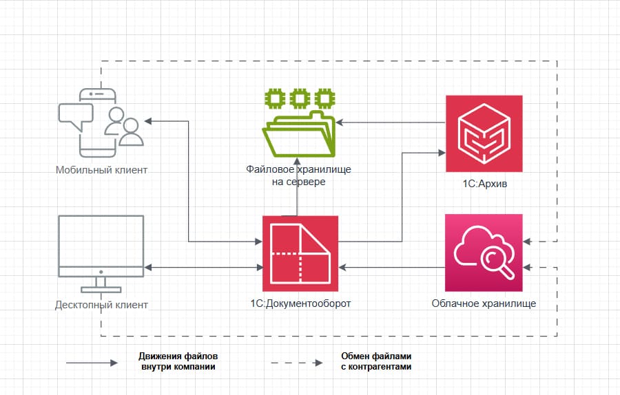 - Связки: в процессе внедрения нужно реализовать и настроить критически важную связку "Пользователь (1С Документооборот) - Контрагент - Договор - Облачная папка".